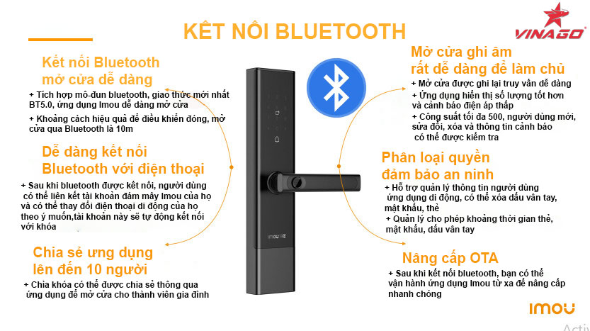 + Kết nối Bluetooth với thao tác dễ dàng, tiện lợi; điều khiển đóng mở từ xa, chia sẻ dữ liệu Bluetooth cho người thân trong gia đình, bạn bè để mở cửa khi bạn đang đi vắng.